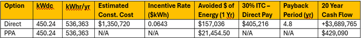 Solar panel ownership is obviously the way to go and the only cost to the city is for the bonding for the project. If the bonding annual debt service is about 5% of the project cost, since the construction cost of $1.35 million is offset by the 30% federal reimbursement of $0.40 million (from the above table – that’s the ITC figure), we get to bond $0.95 million at 5%, which is about $50,000/year.